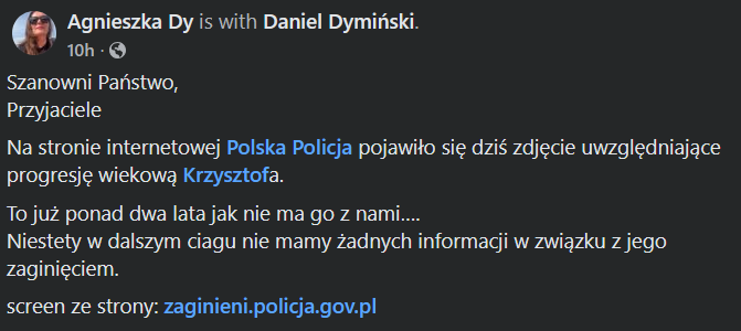 – Na stronie internetowej Polskiej Policji pojawiło się dziś zdjęcie uwzględniające progresję wiekową Krzysztofa. To już ponad dwa lata jak nie ma go z nami… Niestety w dalszym ciągu nie mamy żadnych informacji w związku z jego zaginięciem – dodała.