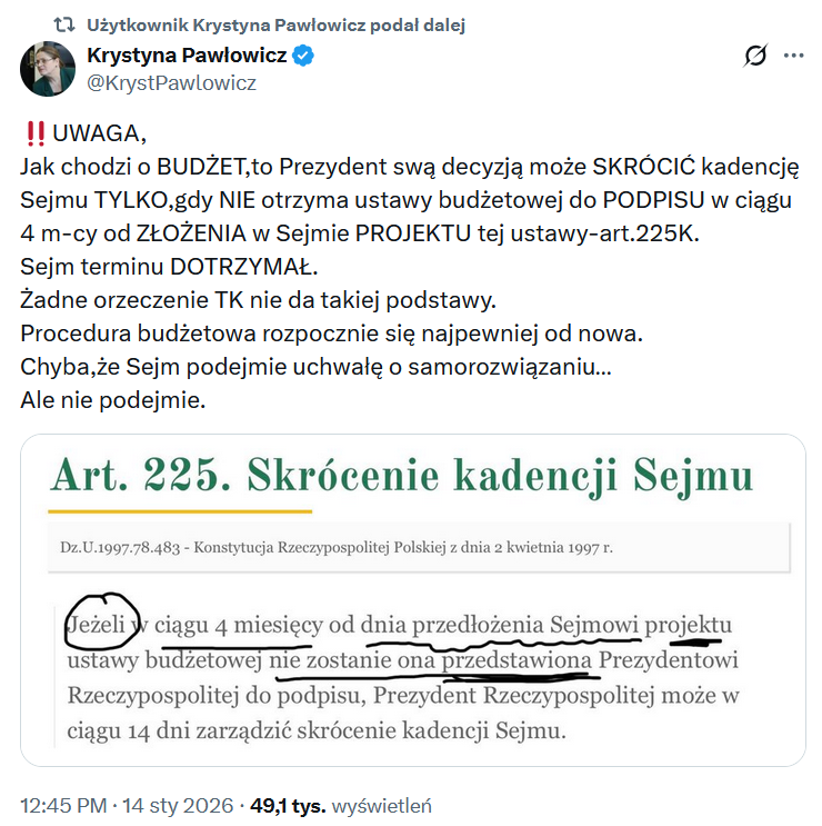 – Prezydent swą decyzją może skrócić kadencję Sejmu tylko, gdy nie otrzyma ustawy budżetowej do podpisu w ciągu 4 miesięcy od złożenia w Sejmie projektu tej ustawy — art. 225 konstytucji. Sejm terminu dotrzymał. Żadne orzeczenie TK nie da takiej podstawy. Procedura budżetowa rozpocznie się najpewniej od nowa. Chyba, że Sejm podejmie uchwałę o samorozwiązaniu. Ale nie podejmie — napisała na portalu X była posłanka PiS.