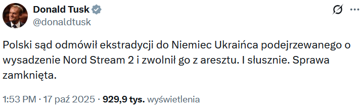 Z kolei premier Tusk pochwalił decyzję sądu. – Polski sąd odmówił ekstradycji do Niemiec Ukraińca podejrzewanego o wysadzenie Nord Stream 2 i zwolnił go z aresztu. I słusznie. Sprawa zamknięta — przekazał.